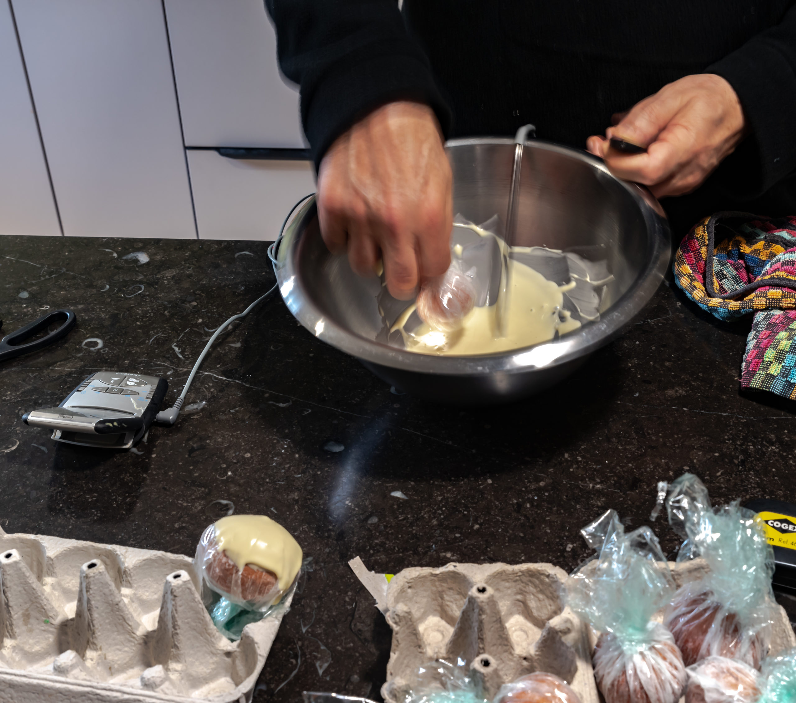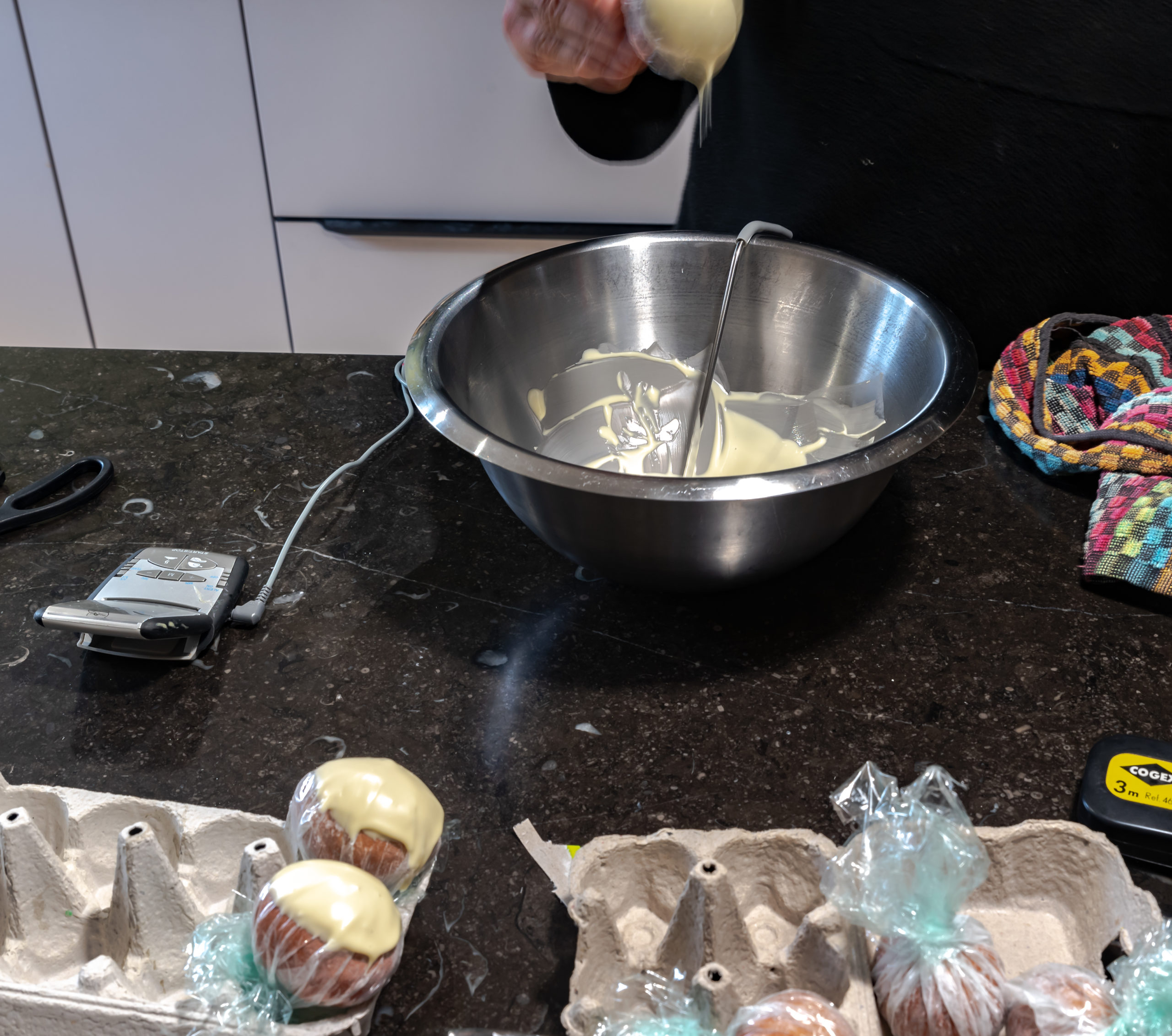 - Après 1 heure assembler les 1/2 sphères pour former 3 boules et remettre au frais.