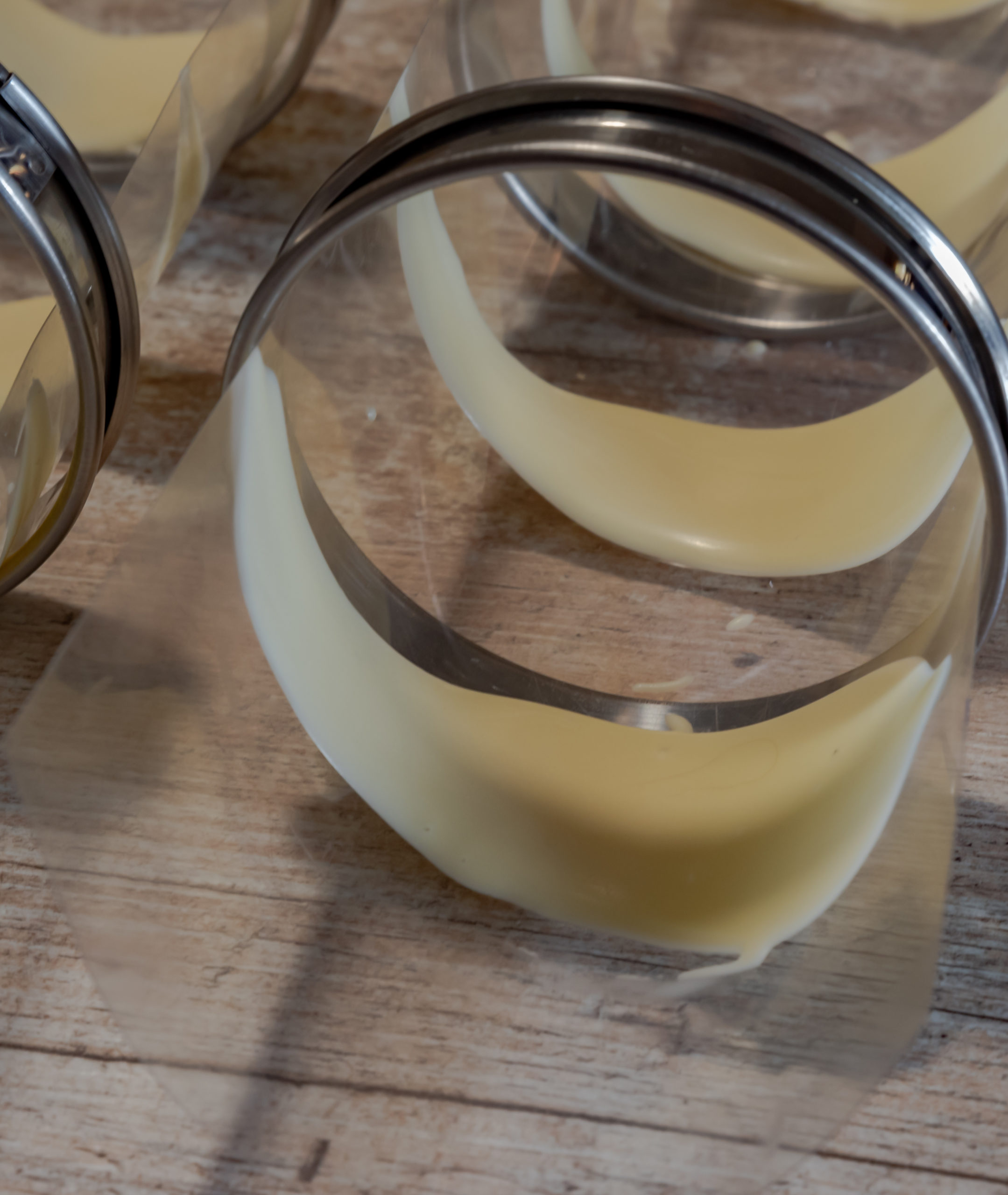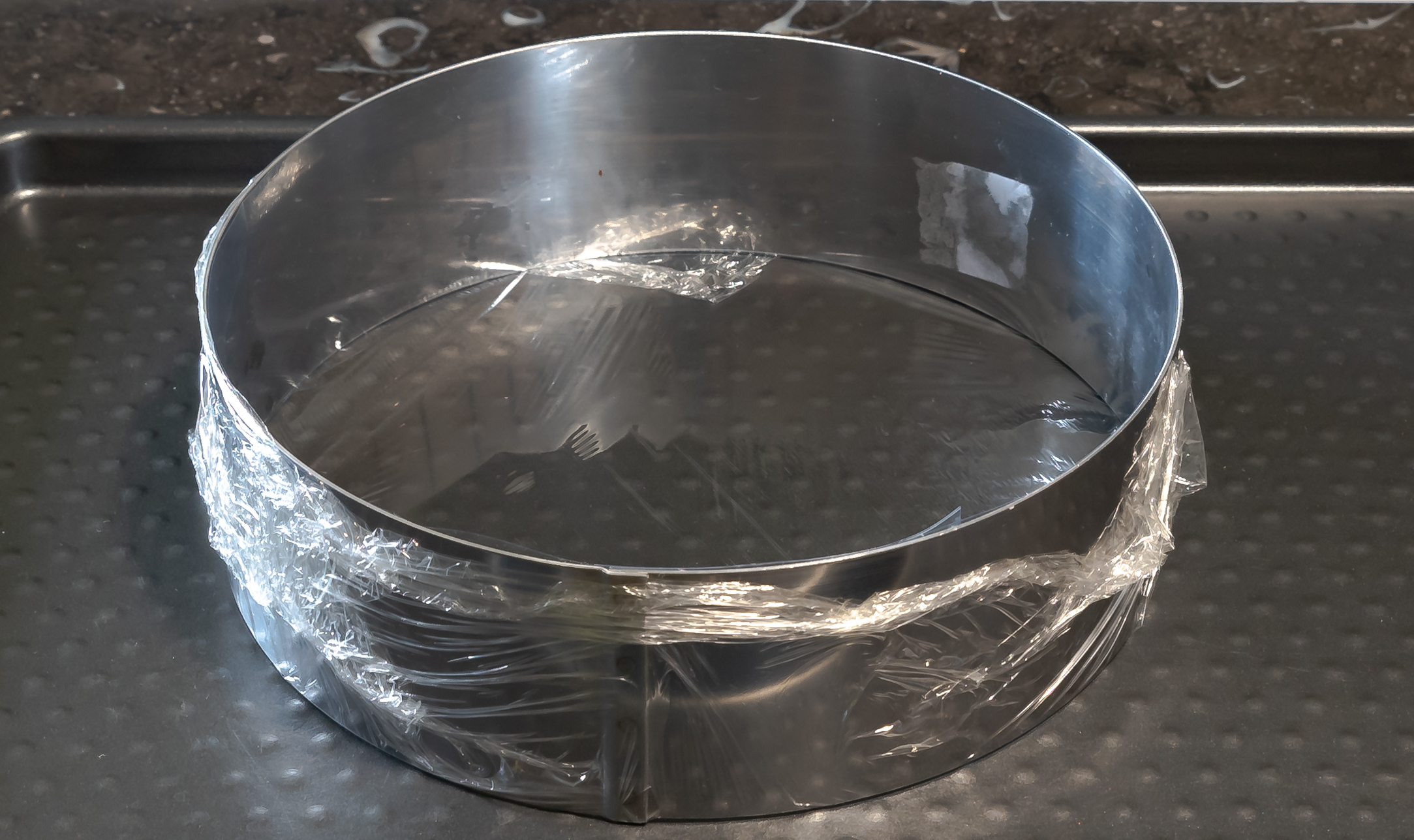 Déposer le moule de 20 cm sur un cercle de présentation avec un rhodoïd à l’intérieur du cercle et un film plastique étirable (de bonne qualité, sinon c’est impossible) sur le fond cercle. Si ça ne colle pas bien vous pouvez humidifier légèrement le cercle, puis tirer doucement sur le film pour bien le tendre.