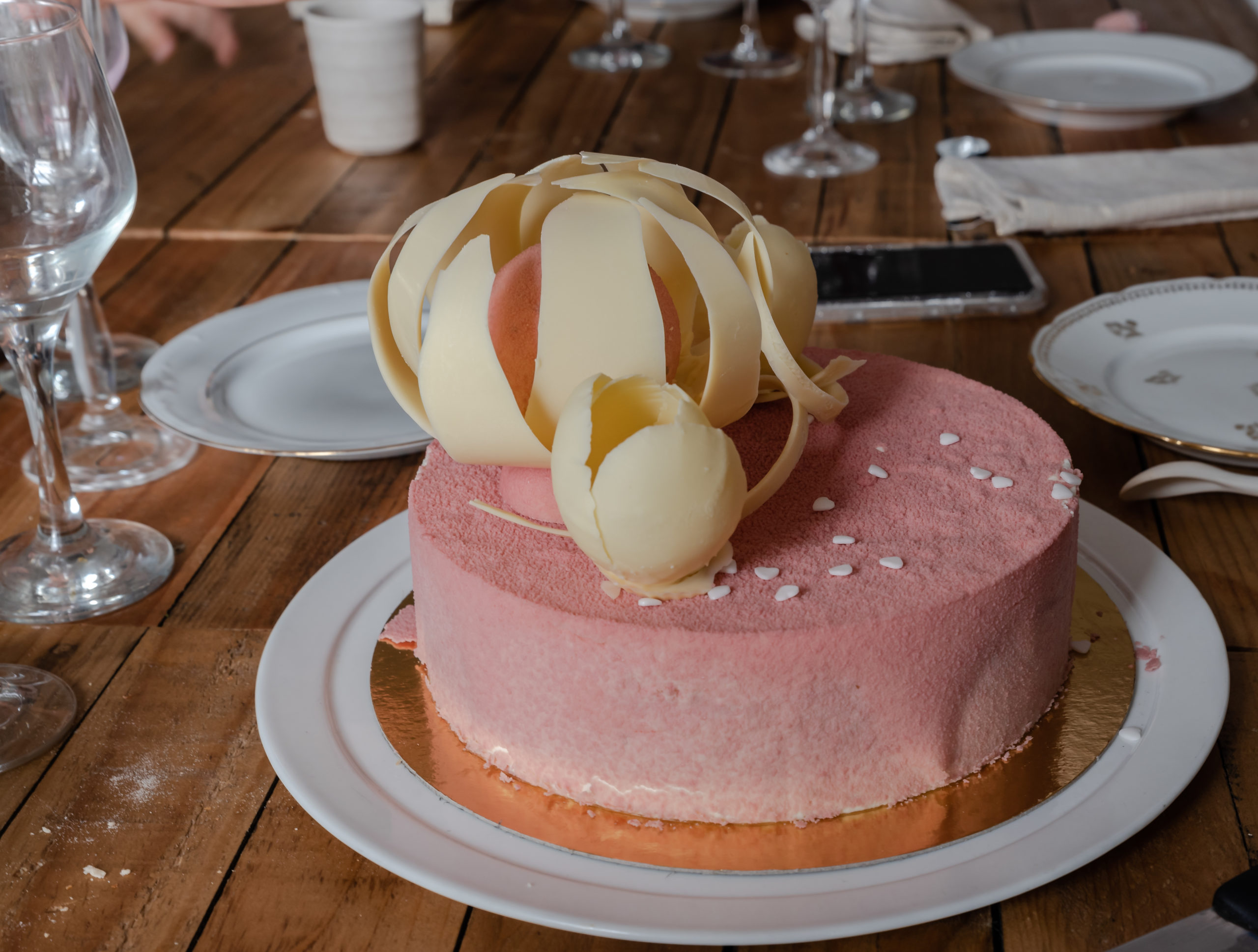Pour l’anniversaire de ma fille Adeline j’ai réalisé un entremets avec comme élément principale le chocolat RUBY et j’ai pu travailler des éléments en chocolat ( très bon exercice sur le chocolat avec ou sans beurre de cacao)…..