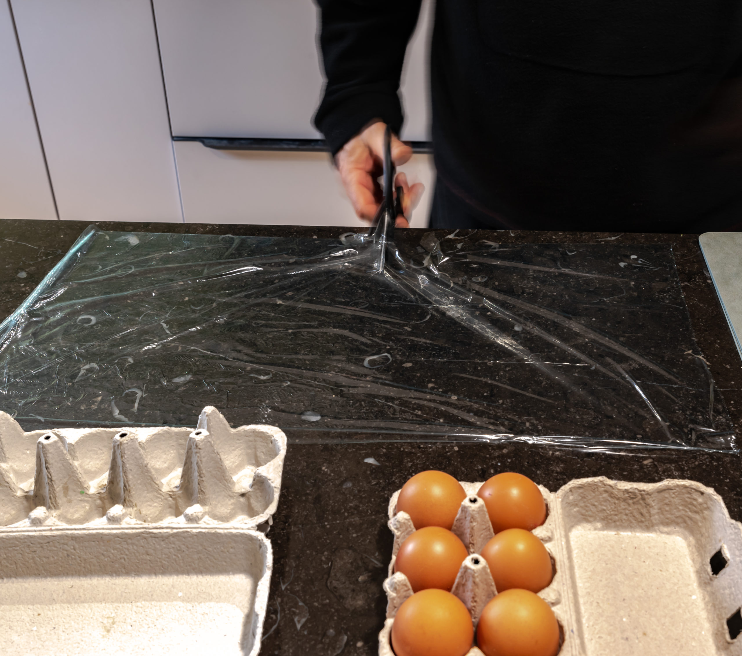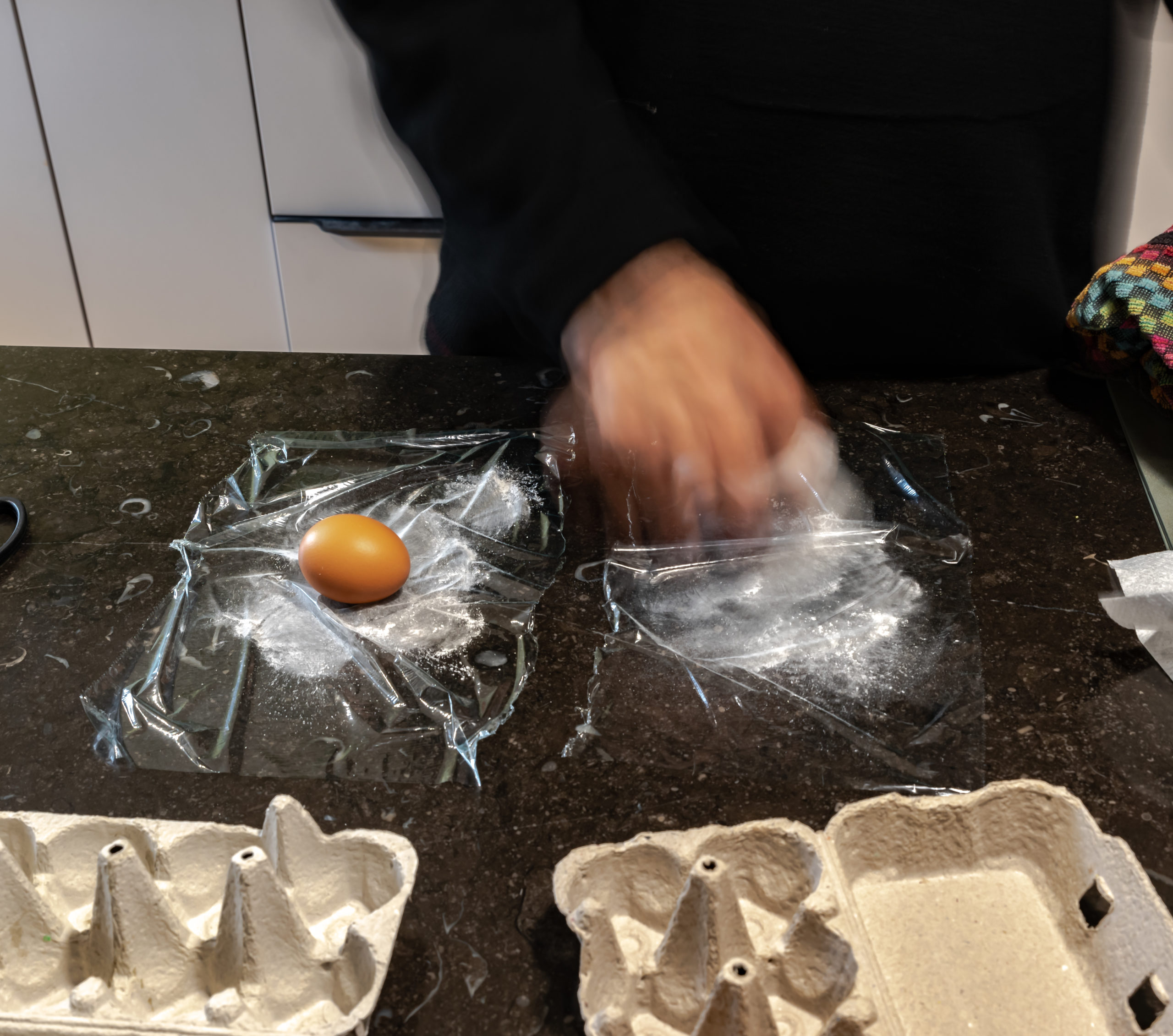 - Suivant le rendu souhaité des oeufs , du film étirable et de l’amidon.